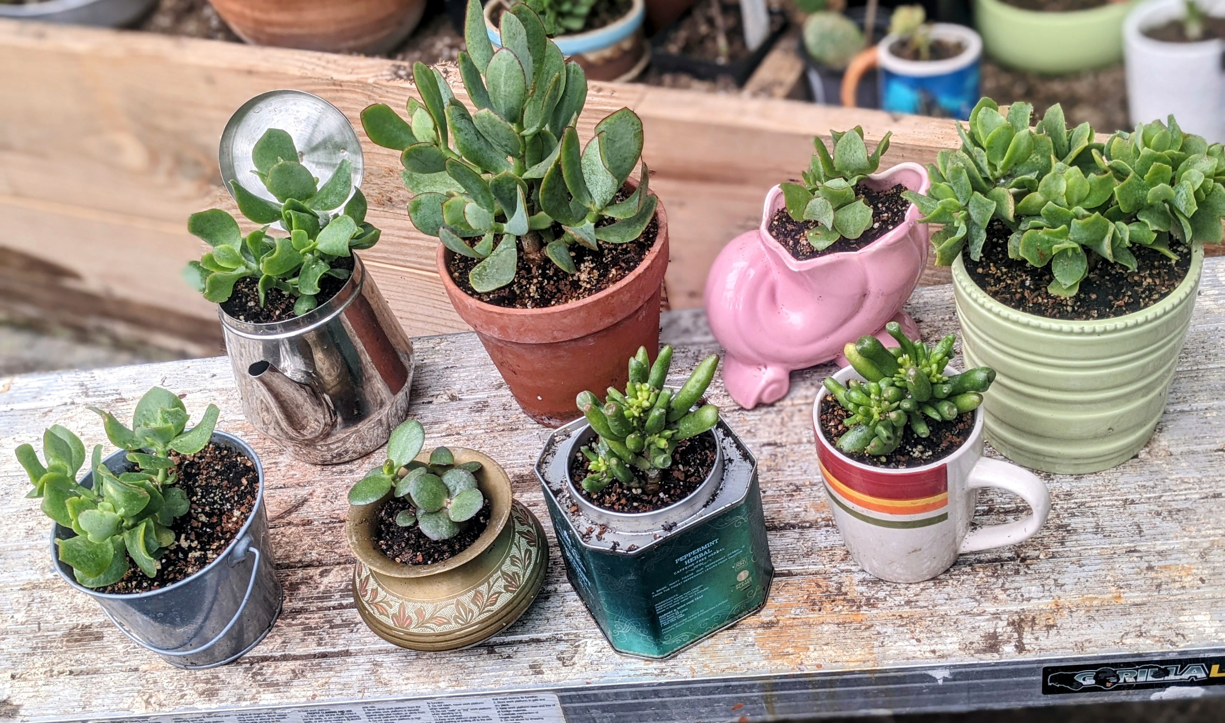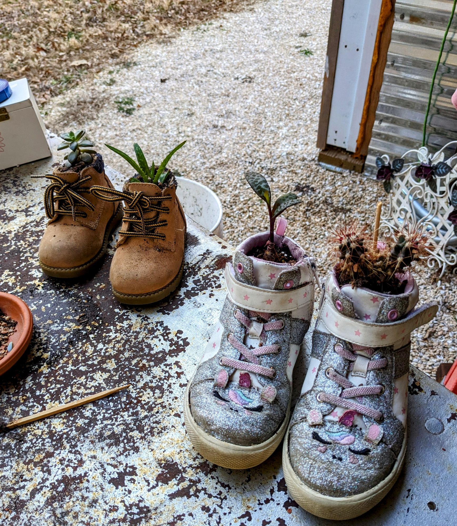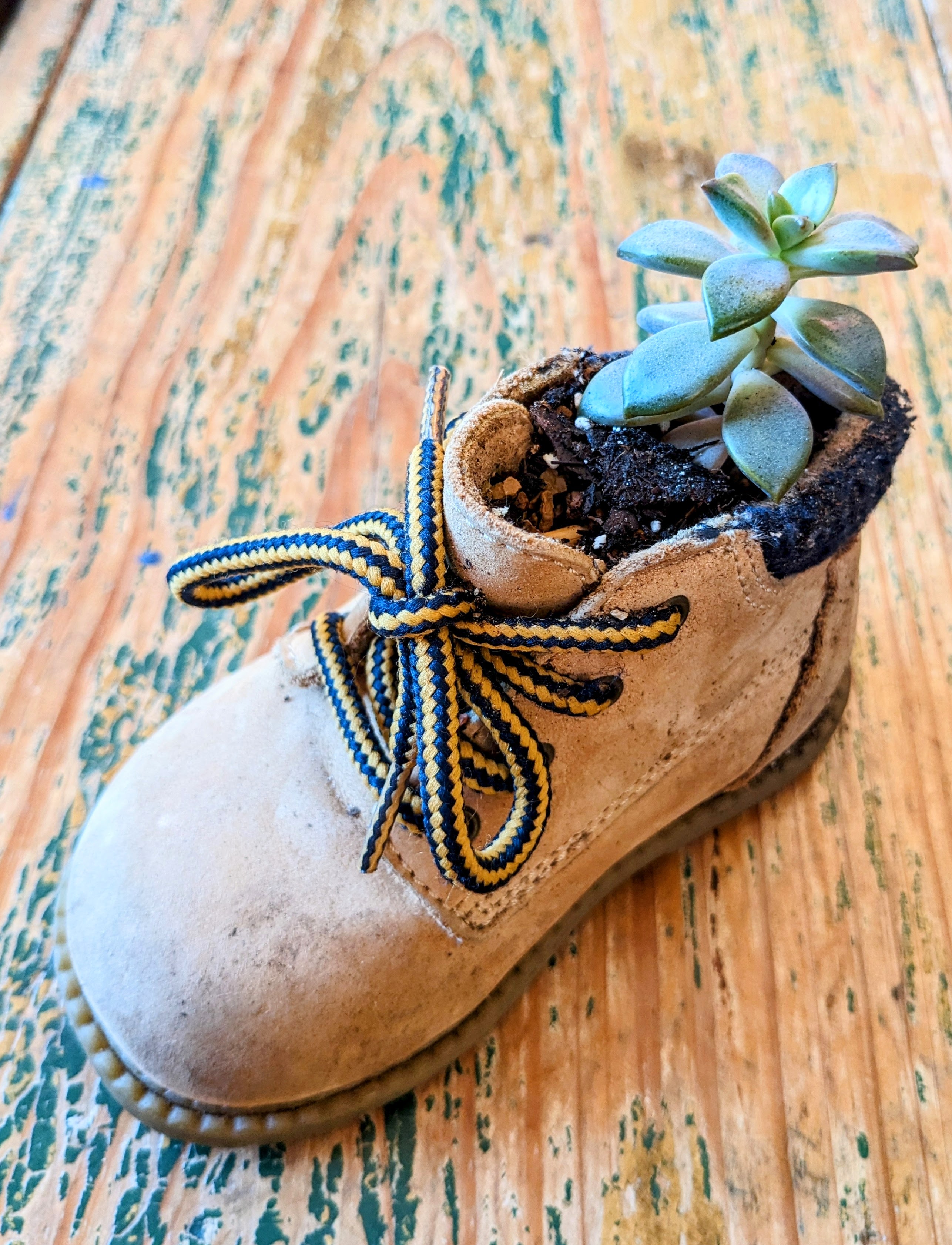 Giererbees loves using up-cycled containers for our plants shoes, bowls, mugs, toys even hats. Anything that holds dirt and doesn’t move is a potential planter. All of our planters have drainage holes and we use succulent soil and a long acting fertilizer in every container.