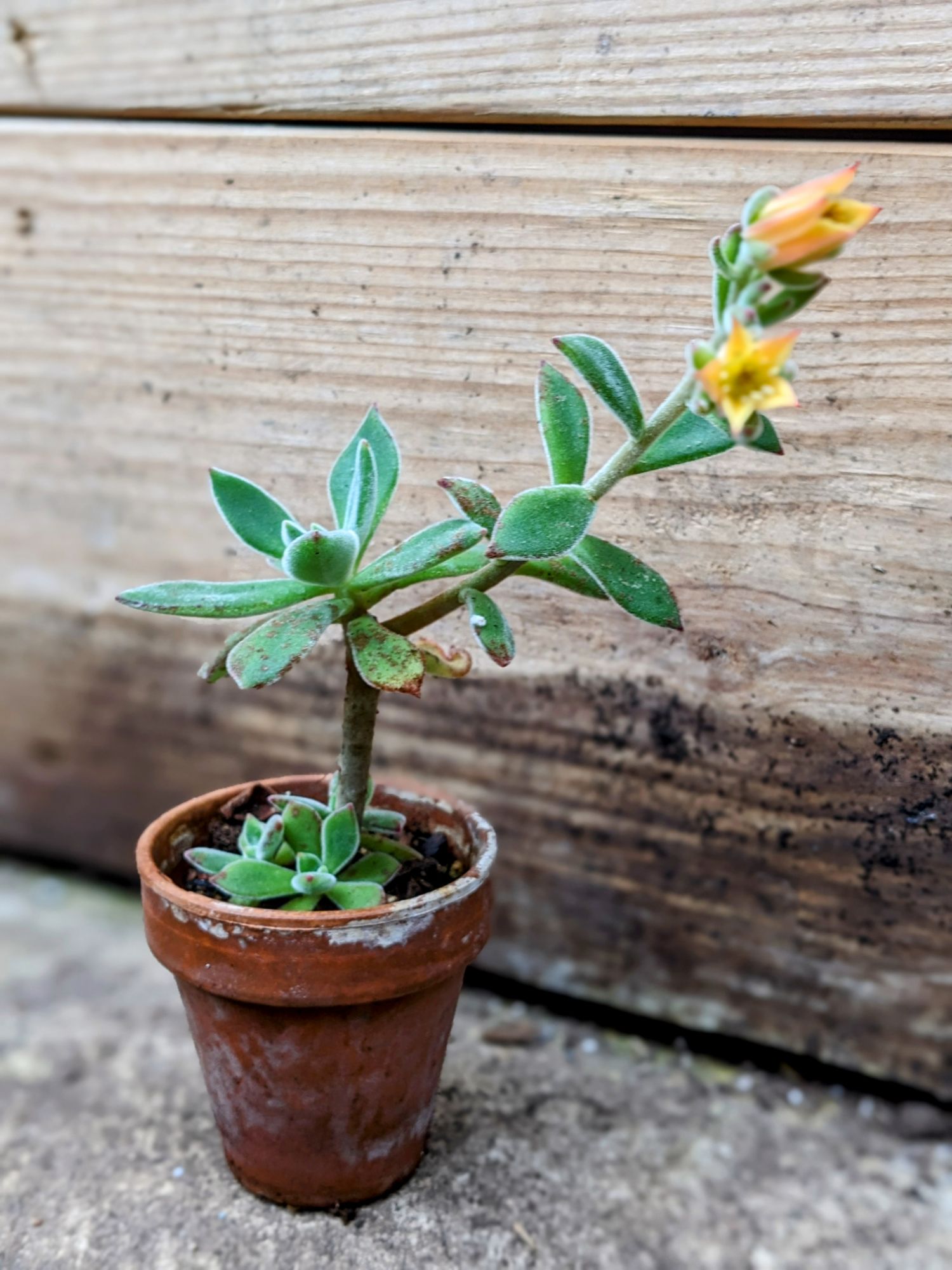 Echeveria Harmsii likes lots of light but prefers to avoid strong afternoon light and will enchant you with its fuzzy green leaves and burnt orange blooms.